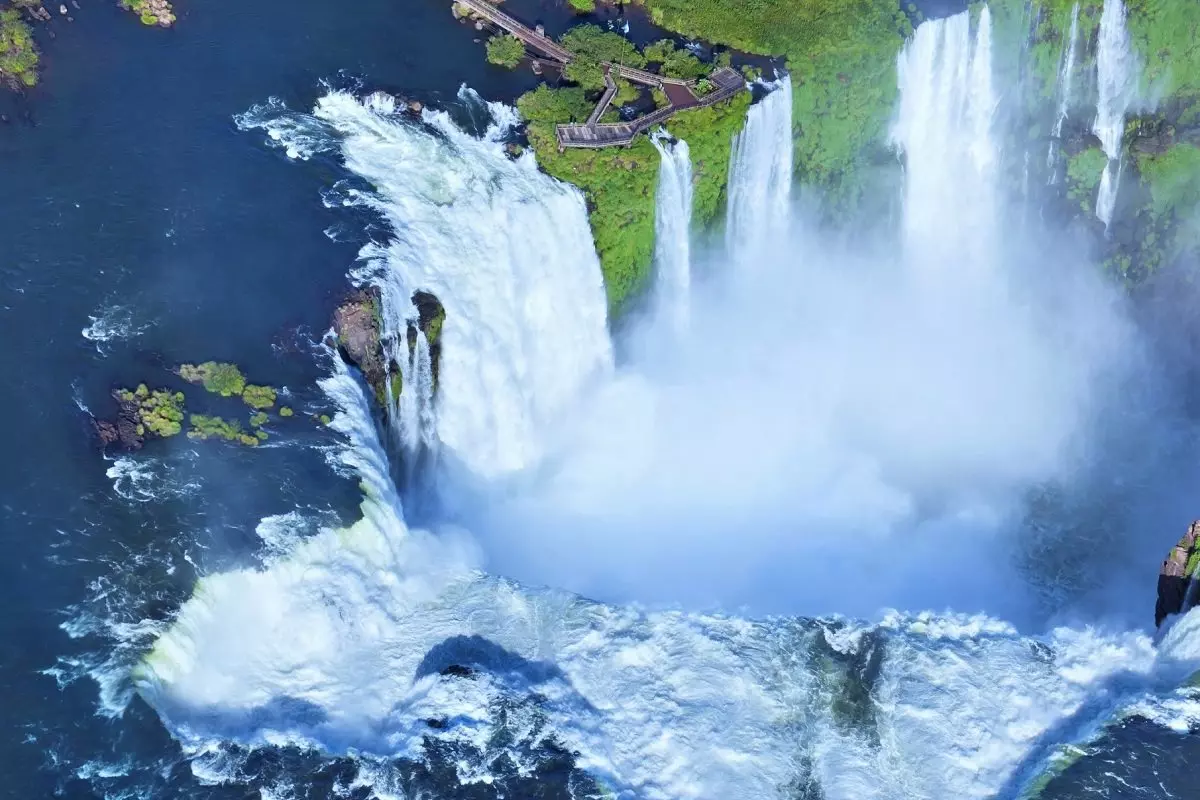 Iguassun putoukset muodostavat maailman suurimman vesiputouksen. Iguaçujoessa kuohuu 2,7 km matkalla yhteensä peräti 275 isoa ja vähän pienempää putousta. Vaikuttavat putoukset ovat totisesti ansainneet paikkansa UNESCO:n maailmanperintöluettelossa. Monet putouksista yhtyvät toisiinsa ja vyöryvät jopa 85 metriä korkean hevosenkengän muotoisen kallionreunan yli. Vaikka Iguassun putoukset eivät kenties ole yhtä kuuluisia kuin Pohjois-Amerikassa sijaitseva Niagara, ne peittoavat pohjoisen serkkunsa niin koossa kuin vaikuttavuudessakin. Niagaran putouksissa virtaa kunnioitettavat 2,8 miljoonaa litraa vettä sekunnissa, kun taas Iguassussa kallionreunan yli vyöryy huimat 6,5 miljoonaa vettä sekunnissa. Tarina kertoo Eleanor Rooseveltin, entisen Yhdysvaltain ensimmäisen naisen tokaisseen Iguassun putoukset nähdessään: ”Niagara on tähän verrattuna kuin tippuva vesihana!”