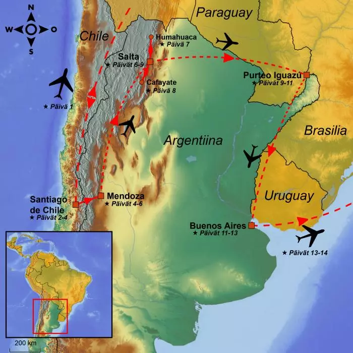 Tämä jännittävä kiertomatka tarjoaa niin maaseutuidylliä kuin kaupunkikulttuuriakin ja vie sinut Andien vuoristosta vehreille viinitiloille ja maailman suurimmalle vesiputoukselle. Matka alkaa Chilen pääkaupungista Santiago de Chilestä, jonka kaupunkikuvalle ovat ominaisia sekä modernit pilvenpiirtäjät että viehättävät historialliset rakennukset. Chilestä matka jatkuu Argentiinaan, missä vieraillaan kuuluisilla Mendozan ja Cafayaten viininviljelyalueilla ja perehdytään viininvalmistusprosessiin rypäleiden korjaamisesta pullotukseen. Siirtomaa-arkkitehtuuristaan tunnetussa Saltassa käydään muun muassa Humahuacan laaksossa ja Conchasin solassa, joiden värikkäissä ja toinen toistaan erikoisemman muotoisissa kivimuodostelmissa riittää ihasteltavaa. Yksi matkan suurimmista kohokohdista on vierailu Iguassun putouksilla, joita ympäröivän sademetsän ainutlaatuinen luonto on myös näkemisen arvoinen. Kiertomatka huipentuu Argentiinan pääkaupunkiin Buenos Airesiin, jota kutsutaan Etelä-Amerikan Pariisiksi. Täällä pääset vierailemaan kaikissa tärkeimmissä nähtävyyksissä ja voit kokea autenttisen argentiinalaisen tangoshow’n.