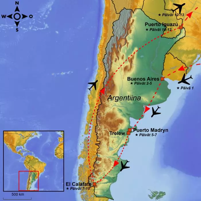 Lento Suomesta Argentiinaan välilaskun/-laskujen kautta.