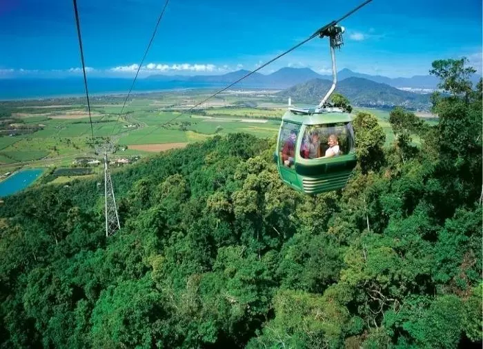 Paluumatka Cairnsiin kuljetaan Skyrail-köysiradalla, joka lipuu hiljaa takaisin kaupunkiin puunlatvoja viistäen.
