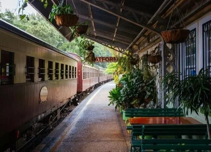 Kiskotie Cairnsista Kurandaan on tänä päivänä kenties maailman kaunein junamatka. 100-vuotias restauroitu juna lähtee Cairnsista ja kipuaa 327 metrin korkeuteen merenpinnasta. Matkan varrella se sukeltaa 15 tunnelin läpi ja ylittää 37 siltaa, ja ikkunoista voit ihastella sademetsiä ja vesiputouksia. Junamatka kestää 3 tuntia, joten nyt voit ottaa rennosti ja vain nauttia matkasta!