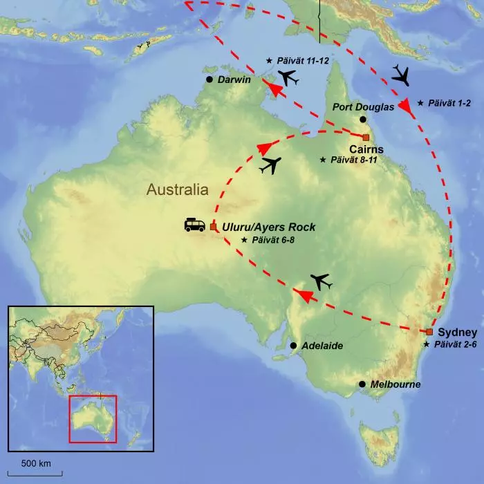 Tällä mielenkiintoisella kiertomatkalla pääset kokemaan kaikki Australian suurimmat kohokohdat ja kiehtovimmat nähtävyydet. Ensimmäiset päivät vietät Sydneyssä, joka on varmasti sijainniltaan yksi maailman kauneimmista kaupungeista. Vilkkaan ihmisvilinän keskeltä suuntaat seuraavaksi punaiselle aavikolle, jonka keskellä kohoaa lumoava kalliomuodostelma: Uluru. Ulurulla ihastelet vaikuttavaa auringonlaskua ja auringonnousua ja patikoit Katatjutan kallioharjanteilla.