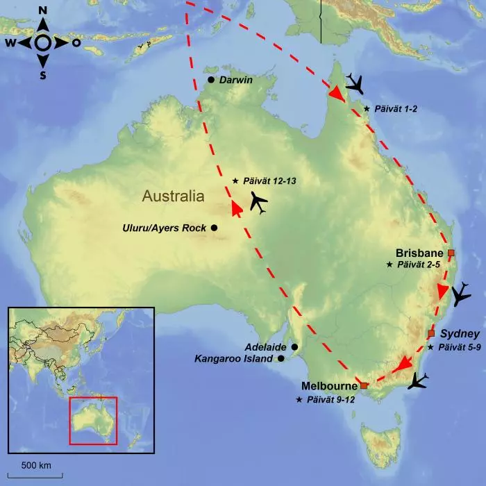 Koe Australian kiehtovimmat kontrastit. Matkusta maan kahdesta suurimmasta kaupungista – Melbournesta ja Sydneystä – punaisen aavikon keskellä kohoavalle Ulurulle. Vietä matkan viimeiset päivät trooppisessa Cairnsissa ja näe Iso valliriutta tai maailman vanhin sademetsä.
