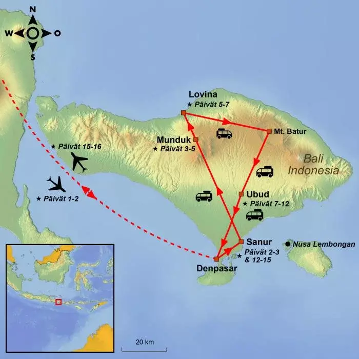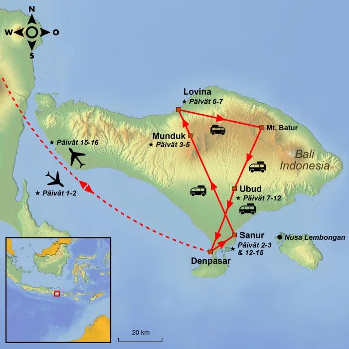 Matka alkaa yhden yön majoituksella Sanurissa, jossa voit rentoutua pitkän lentomatkan jälkeen ja totutella aikaeroon ja lämpimämpään ilmastoon. Seuraavana päivänä otetaan kurssi kohti Mundukin viehättävää ylänköä, jonka maisemia hallitsevat pulppuavat vesiputoukset, viidakot ja kahviplantaasit.