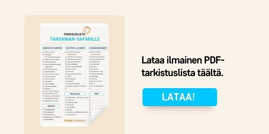 Lue vinkkimme vaatteisiin ja varusteisiin ja katso pakkauslista Tansanian-safarille, ml. ladattava PDF-pakkauslista.