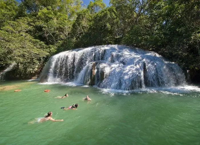Seuraavaksi lähdetään opastetulle kävelyretkelle Rio Mimoso -jokea ympäröivään vehreään luontoon. Matkan varrella ohitetaan peräti yhdeksän erikokoista ja erinäköistä vesiputousta. Voit uida putousten alle muodostuneissa luonnonaltaissa, tutkia pieniä luolia ja ihastella näköaloja Serra da Bodoquenan putouksille ja Mimosojoen laaksoa reunustaville vuorille. Jos olet rohkealla päällä, voit hypätä luonnonaltaaseen 6 metriä korkealta sillalta! Joillain osuuksilla voit myös nousta veneeseen, ottaa rennosti ja vain nauttia maisemista.