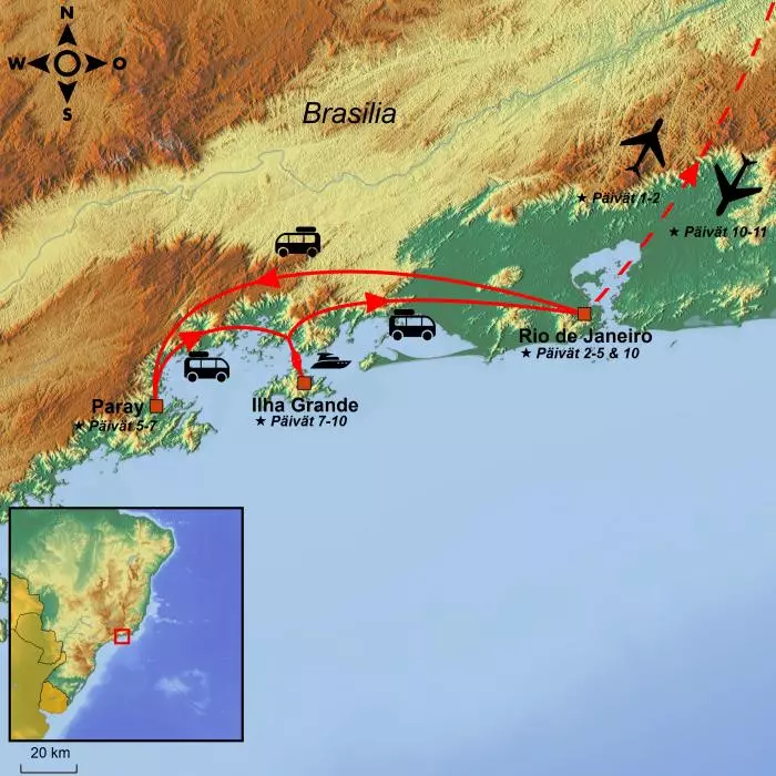 Brasilia on maailman viidenneksi suurin maa, jonka kaikkien nähtävyyksien koluamiseen menisi helposti useampi kuukausi. Tämä kiertomatka keskittyy Rio de Janeiron osavaltioon ja antaa hyvän maistiaisen siitä, mitä kaikkea tällä kauniilla, monipuolisella ja mielenkiintoisella maalla on tarjottavanaan.