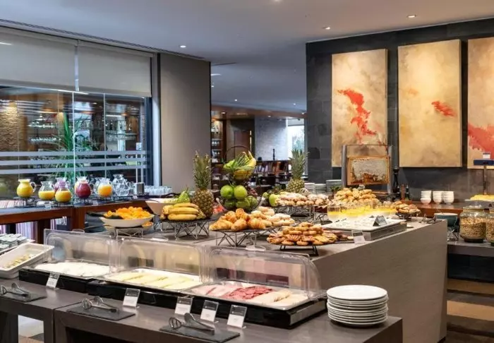 Pitkän päivän jälkeen on mukava rentoutua loungen pehmeissä nojatuoleissa, ja aamulla päivä lähtee hyvin käyntiin tukevalla buffet-aamiaisella.