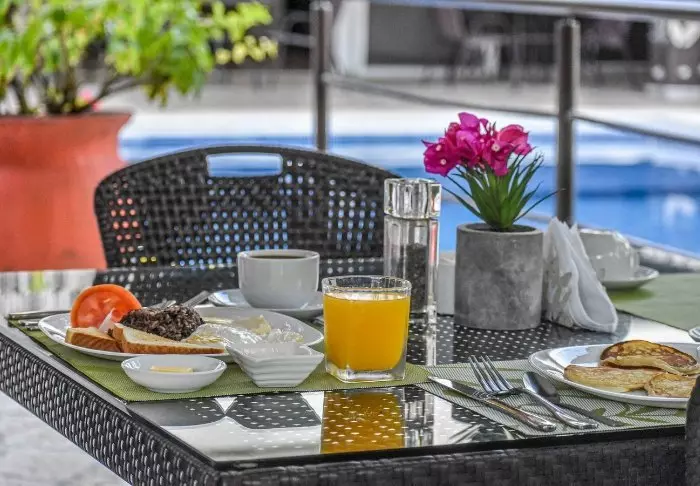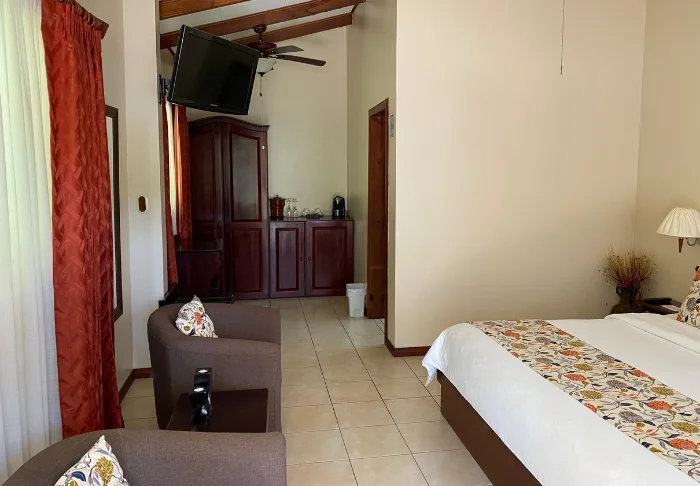 Majoitukseesi sisältyy aamiainen, jonka kanssa tarjoillaan paikallisista costaricalaisista kahvipavuista valmistettua kahvia. Aloita aamusi kävelyllä hotellin pienessä trooppisessa puutarhassa, jossa voit nähdä lintuja ja perhosia. Uima-altaan äärellä on mukava rentoutua hyvän kirjan parissa tai trooppisia drinkkejä siemaillen. Hotellin ravintolasta voi myös tilata kevyttä syötävää.