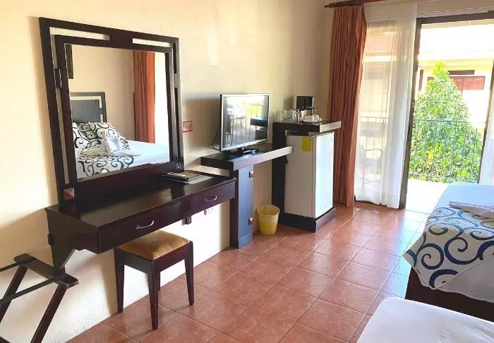 Hotellissa on kaksi kerrosta ja vain 24 huonetta, joissa kaikissa on oma terassi tai parveke puutarha- tai allasnäköalalla. Värikkäästi sisustetut huoneet ovat hieman vanhanaikaisen oloisia, mutta niissä on kuitenkin kaikki tarvittava, kuten TV, kattotuuletin, ilmastointi, jääkaappi, tallelokero ja oma WC.
