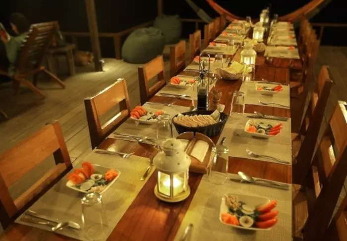 Maisemia voit ihailla myös loungealueelta ja ravintolasta, jossa aamiainen (sisältyy), lounas ja illallinen tarjoillaan isolle katetulle terassille. Illallinen ravintolassa on huikea elämys jo itsessään. Ateria koostuu useista eri ruokalajeista, joilla herkutellaan yhdessä muiden vieraiden kanssa ison pöydän ääressä. Illallinen tarjoaa siis hyvän tilaisuuden jutella päivän kokemuksista ja tutustua muihin hotellivieraisiin. Huomaa, että illallinen ei sisälly majoitukseen, mutta sen voi halutessaan varata aamiaisen yhteydessä.