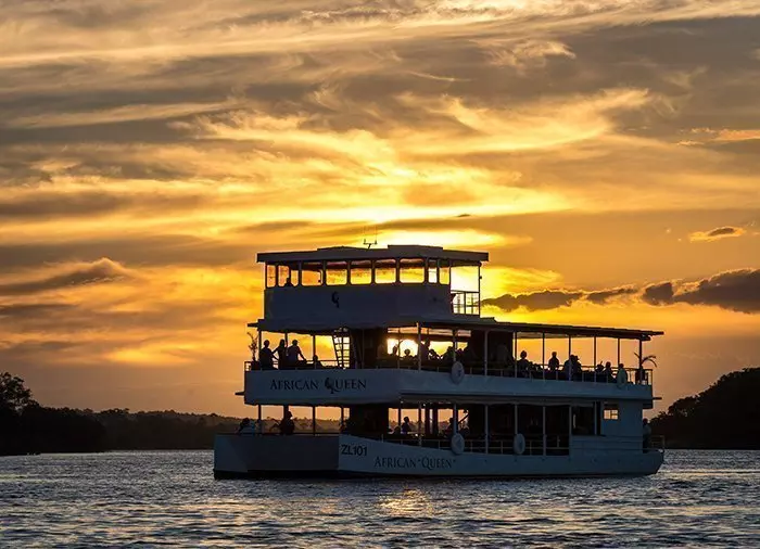 Tältä saarelta sinut noudetaan toisella laivalla, ja retki jatkuu auringonlaskuristeilyn merkeissä. Auringonlaskusta nautitaan ”The African Queenissä” tai ”The African Princessissä”, klassisissa katamaraaneissa, joissa on todellista siirtomaa-ajan tunnelmaa.