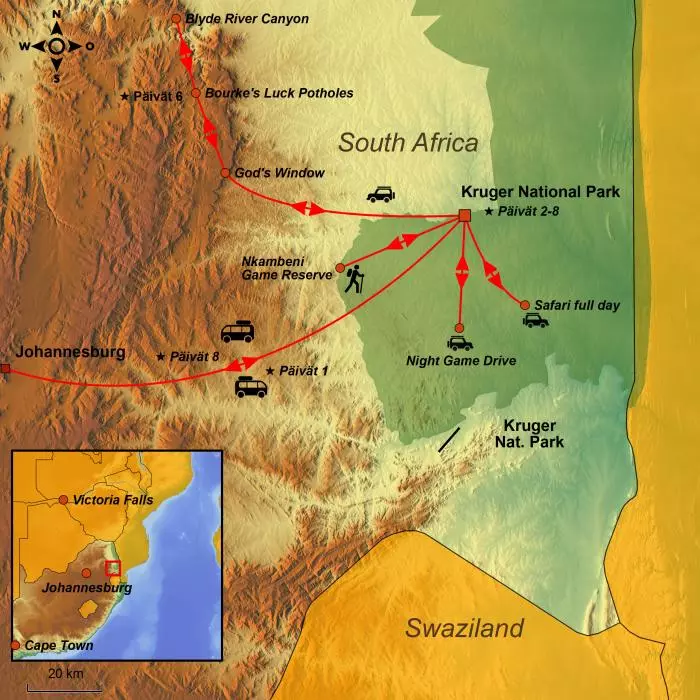 Tällä matkalla majoitut Kruger Gate Hotel aivan maailmankuulun Krugerin kansallispuiston vieressä. Sinulla on tilaisuus päästä lähelle ”Big 5” -villieläimiä ja oppia tulkitsemaan luonnon merkkejä kokeneen metsänvartijan vetämällä bushwalk-retkellä. Pääset kiipeämään myös Lohikäärmevuorille, jotka muodostavat Etelä-Afrikan pisimmän ja korkeimman vuoristojonon. Lohikäärmevuorilta on henkeäsalpaavat näkymät Blyde River Canyoniin, joka on maailman kolmanneksi suurin kanjoni ja yksi matkan kohokohdista. Voit ihailla maisemia myös God’s Window -näköalapaikalta sekä ihastella Blyde- ja Treur-jokien vuosien saatossa kallioon vuolemia Bourke’s Luck Potholes -hiidenkirnuja.