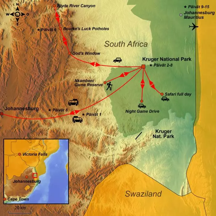 Nauti upeista luonto- ja eläinelämyksistä Krugerin kansallispuistossa. Majoitu lodgessa vain kivenheiton päässä puistosta ja katsele villieläimiä uima-altaalta käsin. Rentoudu lopuksi Mauritiuksen eksoottisilla paratiisirannoilla.