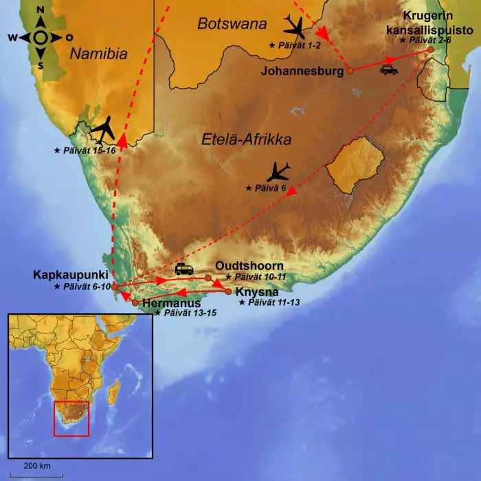 Matka alkaa lennolla Suomesta Johannesburgiin välilaskun/-laskujen kautta.