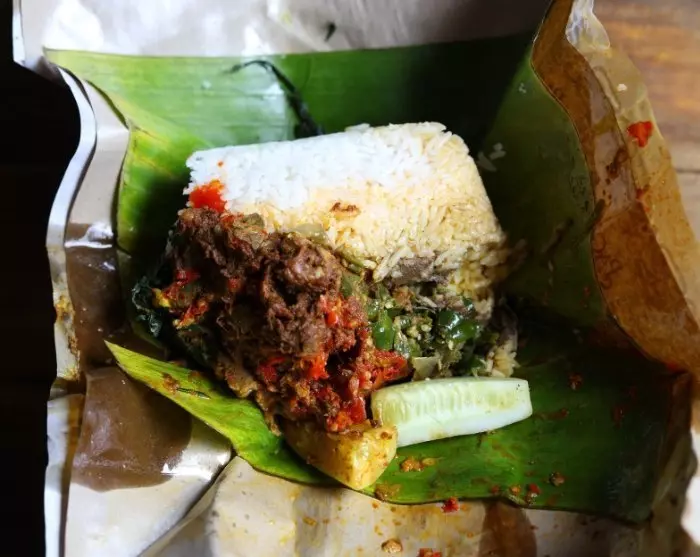 Polkupyörämatka päättyy pieneen paviljonkiin rannalla, jossa voit nauttia perinteisen ”Nasi Bungkus” -aterian, joka koostuu riisistä ja lihasta, joita monet paikalliset ottavat mukaan matkalle.