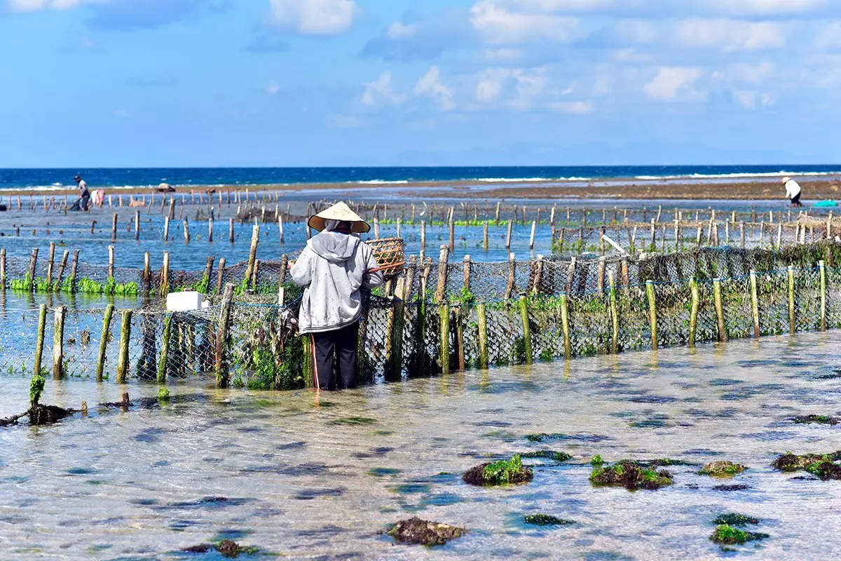 Monet saaren asukkaista saavat elantonsa merilevän viljelystä. Laskuveden aikaan leväpellot tulevat esiin veden alta, ja voit nähdä viljelijöiden kahlaavan nilkansyvyisessä vedessä ja poimivan leviä isoihin punottuihin koreihin. Kerätyt merilevät kuivatetaan lopuksi auringossa.