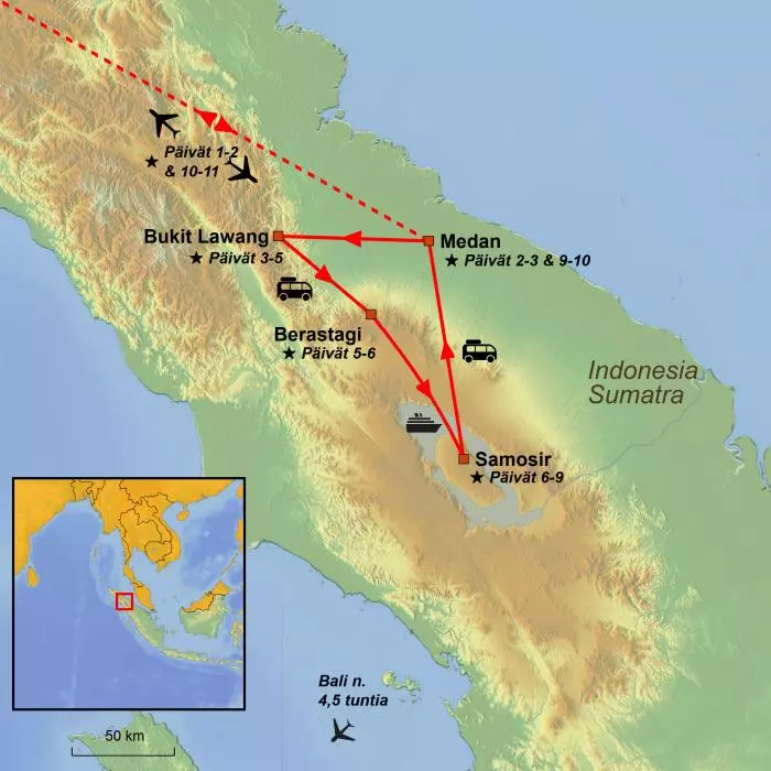 Tällä kierroksella pääset tutustumaan Gunung Leuser -kansallispuistoon ja sen orankeihin kolmen tunnin sademetsävaelluksella. Vierailet myös Berastagin ylängöllä ja Lumbinin puistossa ennen suuntaamista Toba-järvelle ja Samosir-saarelle. Matkalla käyt perinteisissä Batak-kylissä, joissa saat käsityksen asukkaiden kulttuurista ja elämäntyylistä, johon kuuluvat härkävankkurit ja käsityöt.