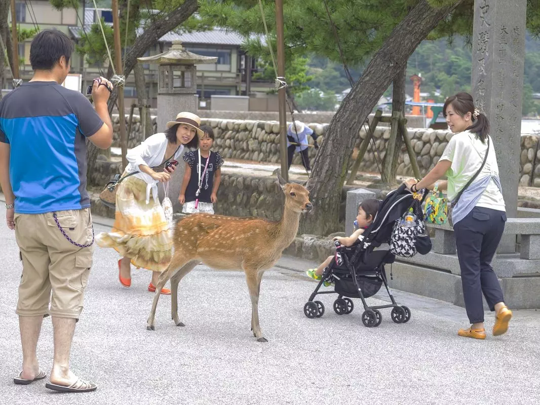 Suosittelemme päiväretkeä Miyajimaan. Miyajima, viralliselta nimeltään Itsukushima, sijaitsee alle tunnin matkan päässä Hiroshimasta, ja sinne on helppo päästä julkisilla liikennevälineillä. Saaren edustalle mereen on pystytetty lähes 20 metriä korkea oranssi torii-portti, joka on monista kuvista tuttu. Nousuveden aikaan vaikuttaa siltä, kuin portti kelluisi veden päällä. Kun saavut lautalla saarelle, kuljet ensin ohi muutamien turistikatujen, matkamuistomyymälöiden ja pienten leivoskauppojen ja kahviloiden ennen kuin saavut paikkaan, josta voit nähdä torii-portin. Matkan varrella kohtaat taatusti myös kesyjä japaninpeuroja. Saarella sijaitsee myös buddhalainen temppelikompleksi Daisho-in, joka on avoinna vierailijoille. Saarelle erityistä on, että Buddhan patsaat on usein puettu kaulaliinoihin ja hattuihin. Voit myös matkustaa köysirataa pitkin Misen-vuoren huipulle, josta avautuu huikea näköala Hiroshimaan ja sisämerelle, jota täplittää yli 3000 pikkusaarta.