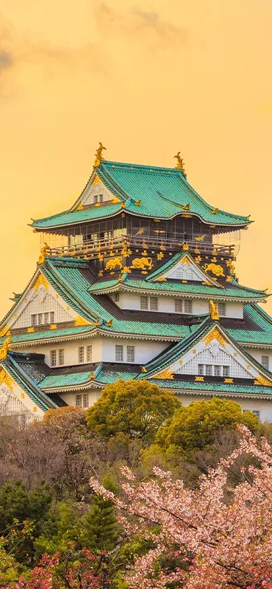 Osakan asemalla sinua on vastassa opas, joka saattaa sinut hotelliisi. Seuraavaksi odottaa jännittävä puolipäiväretki, jonka aikana matkustat oppaasi johdolla julkisilla kulkuneuvoilla shōgunien aikakaudelta peräisin olevaan Osakan linnaan. Linna on erittäin vaikuttava ja ulkopuolelta yksi koko maan kauneimmista linnoista. Linnassa ja sen puistossa kierrellessäsi saat kuulla shōgun Hideyoshin suuruuden ajasta. Hideyoshi käytti linnan rakentamiseen peräti 100 000 työmiestä, ja se valmistui kolmessa vuodessa. Osakan linna on tuhoutunut tulipalossa monta kertaa, mutta se on aina rakennettu uudelleen, viimeksi vuonna 1931. Ylimmässä kerroksessa on näköalatasanne, josta avautuu henkeäsalpaava näköala Osakan yli.