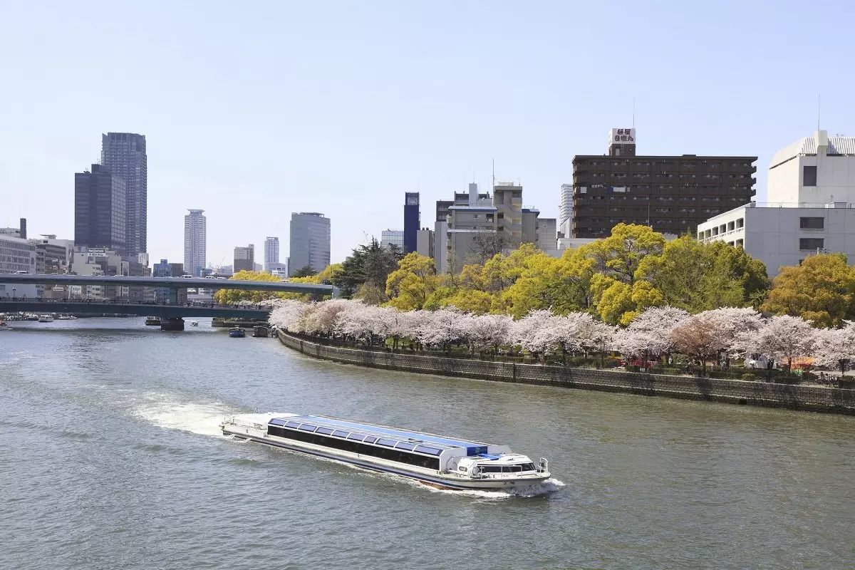 Osakan linnasta kävellään lyhyt matka jokirantaan, jossa noustaan Aqualiner-laivaan ja lähdetään sightseeing-kierrokselle Osakan vesiteitä pitkin.