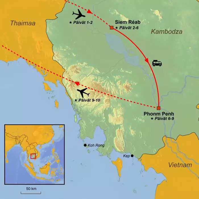 Sinut noudetaan hotelliltasi ja viedään Phnom Penhin lentokentälle, josta lennät välilaskujen kautta Suomeen. Vaihtoehtoisesti voit varata kiertomatkan jälkeisen rantaloman joko Koh Rongin paratiisisaarella tai Kepin rannikkokaupungissa.