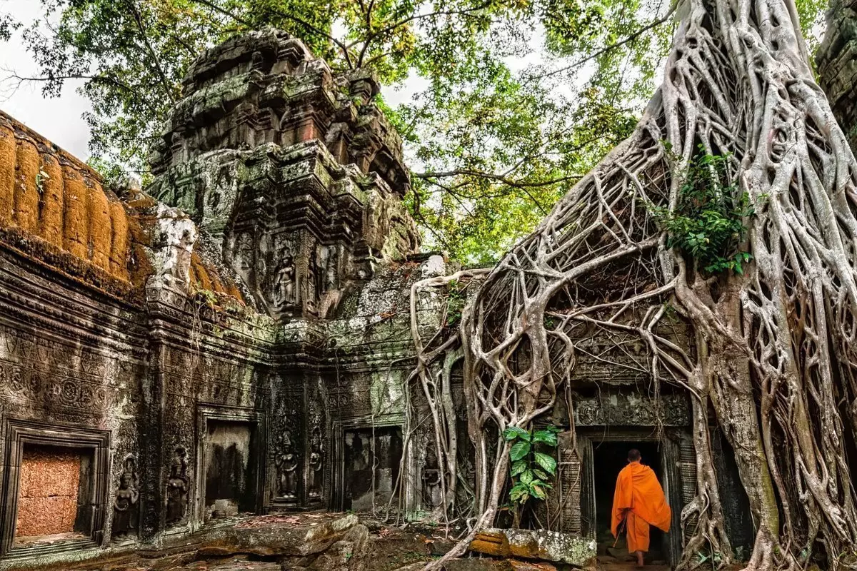 Lopuksi vierailet vielä kuuluisassa Ta Prohmin temppelissä. Ta Prohm tunnetaan raunioiden keskelle kasvaneista puista, jotka ovat nivoutuneet yhteen rakennusten kanssa niin, että kivet ja rungot näyttävät sulautuneen toisiinsa.