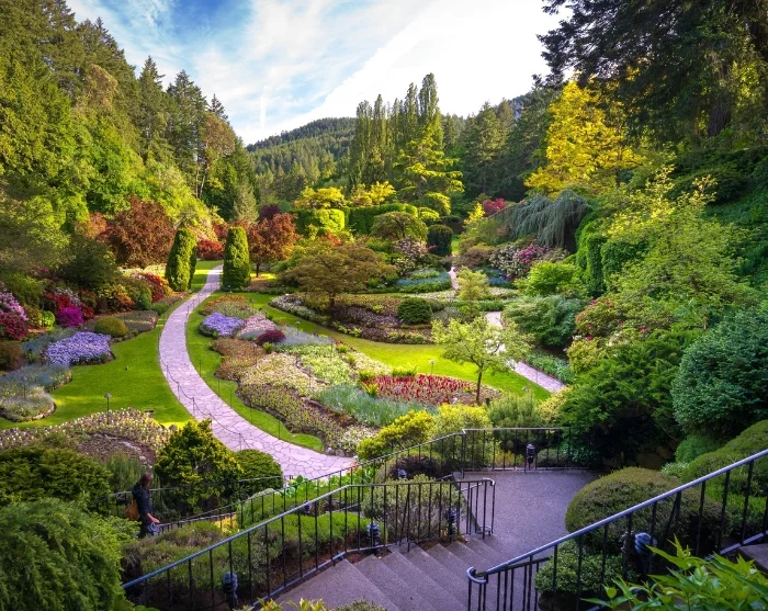 Lähde tutkimaan Victorian Butchart Gardensia, kansallishistoriallista maamerkkiä, joka on täynnä värikkäitä kukkapenkkejä, vihreitä nurmikoita ja hyvin suunniteltuja polkuja.