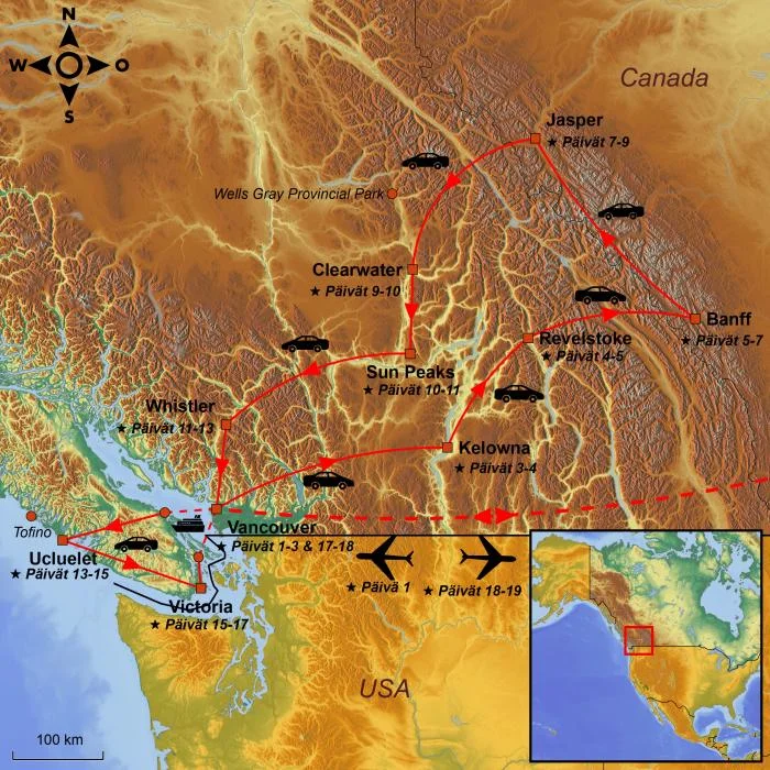 * Jos haluat noutaa vuokra-autosi vasta lähtiessäsi Vancouverista kiertomatkalle, kysy asiasta matka-asiantuntijaltasi.