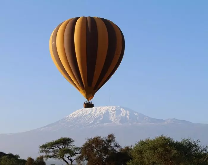 Kuumailmapallosafari Amboselin kansallispuistossa on ainutlaatuinen elämys. Missä muualla voit leijua kuumailmapallon kyydissä ja nähdä samaan aikaan sekä norsuja että maailman korkeimman vapaasti seisovan vuoren?