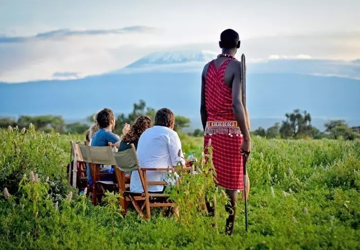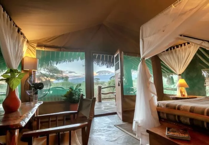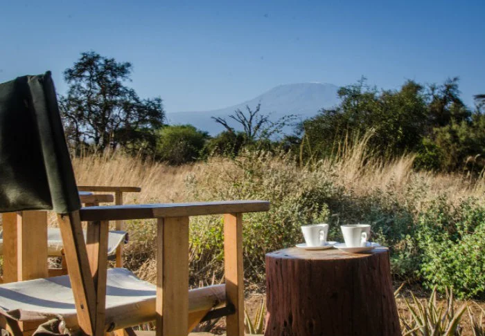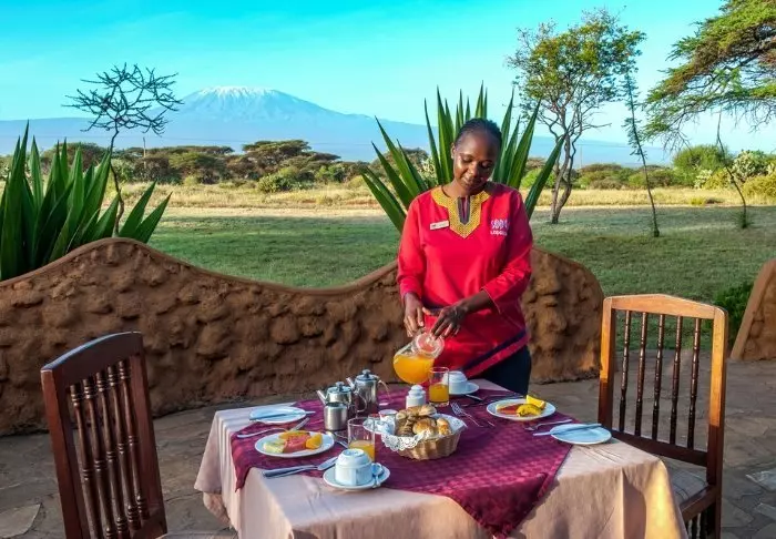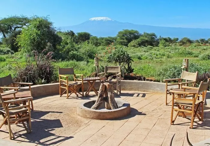 Viihtyisä leiri sijaitsee aivan Amboselin kansallispuiston ulkopuolella ja tarjoaa upean näköalan Kilimanjarolle.