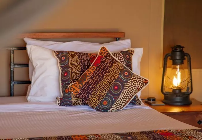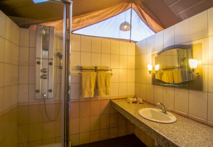 Tilavissa teltoissa on oma kylpyhuone, tavallinen sisä-WC sekä suihku, josta tulee kylmää ja lämmintä vettä. Lattiat ovat kiinteitä parkettilattioita, mutta seinät ovat kangasta, joten voit edelleen kuulla ja haistaa ympäröivän luonnon. Saat siis kokea aidon ”bush-elämyksen” – mutta mukavuudesta tinkimättä.