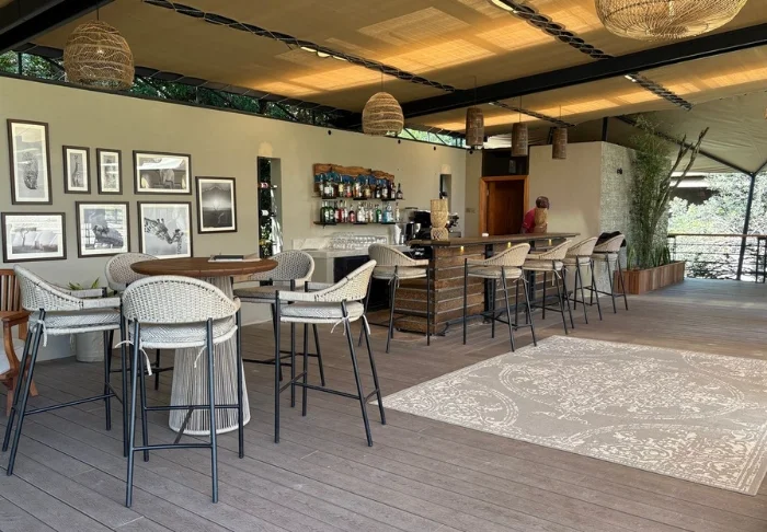 Suurin houkutin on leirin oma ”lounge”. Istahda pehmeään nojatuoliin, tilaa kylmä juoma ja nauti upeasta näköalasta joelle. Tämä paikka on erityisen vaikea jättää taakseen, kun on aika jatkaa matkaa! Onneksi ravintolaan ei ole pitkä matka, sillä se sijaitsee loungen naapuriteltassa. Ruoka on herkullista, ja hyvällä onnella voit saada aamiaisvieraaksi leirin alueelle vaeltavan norsun.