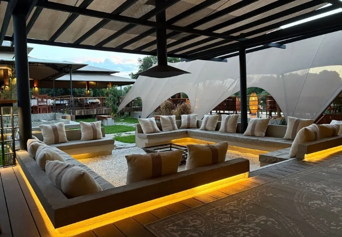 Voi kuitenkin olla vaikeaa irrottautua baarin lämpimästä ilmapiiristä. Sieltä löydät pehmeät sohvat, upeat näkymät, WiFi:n, erinomaisia juomia ja kodikkaan tunnelman. Ravintola ei ole kaukana, ja se on yhtä viehättävästi sisustettu kuin muu leiri. Ruoka on todella herkullista – voit esimerkiksi luoda oman pizzan, joka paistetaan kiviuunissa.