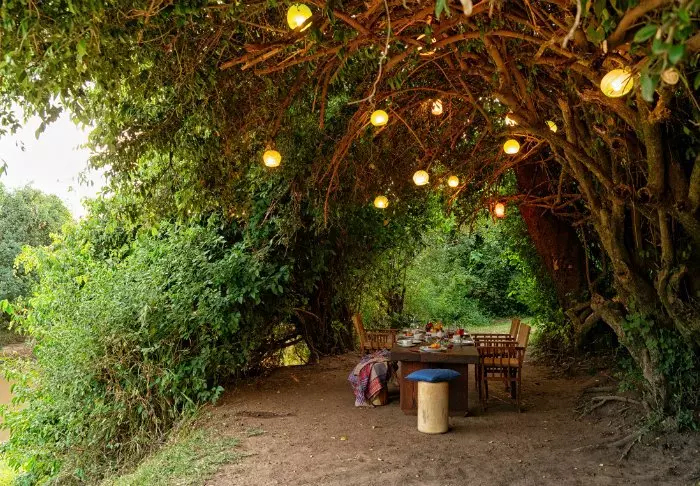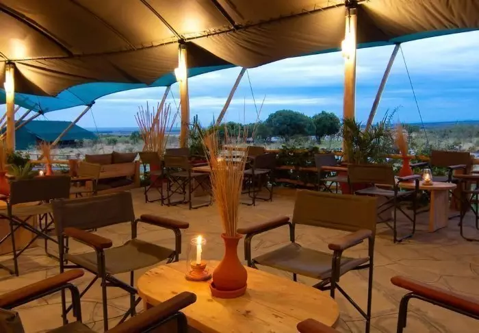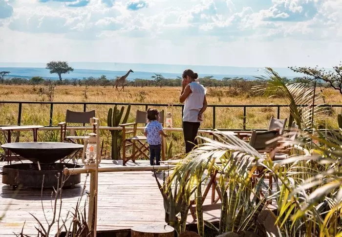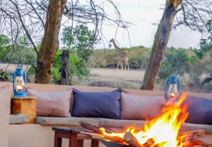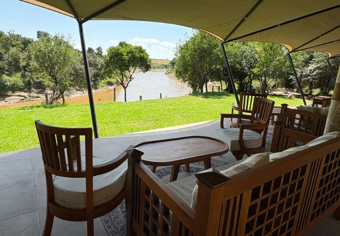 Tunnet olosi tervetulleeksi heti ensi hetkestä alkaen, ja on vaikea olla vaikuttumatta joen toisella puolella siintävistä tasankonäkymistä. Leirin sisäänkäynti on suunniteltu niin, että katse hakeutuu kohti muurattua nuotiopaikkaa, istumapaikkojen värikkäitä tyynyjä ja taustalla avautuvaa upeaa Masai Maraa.