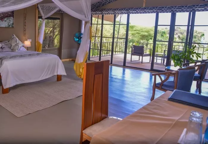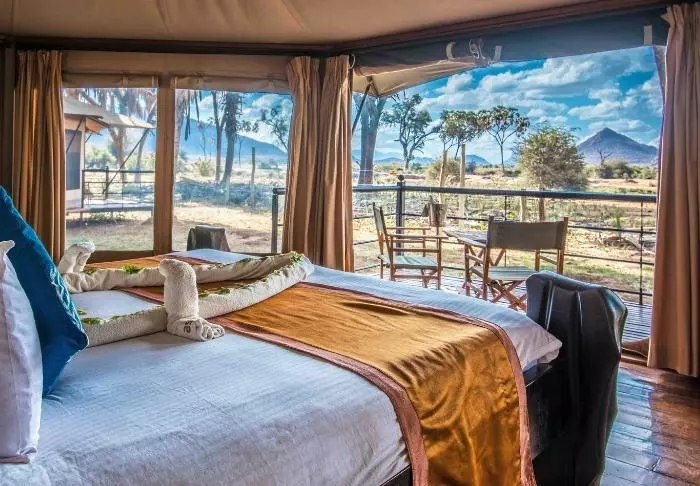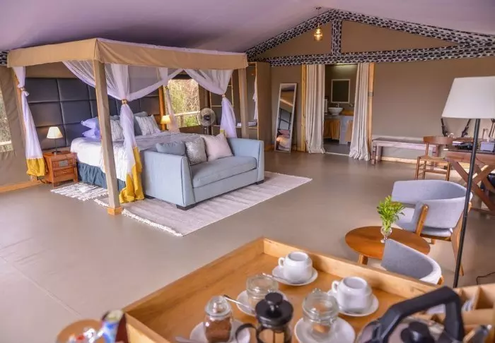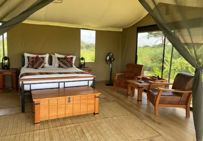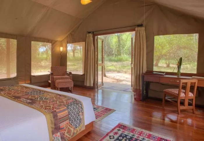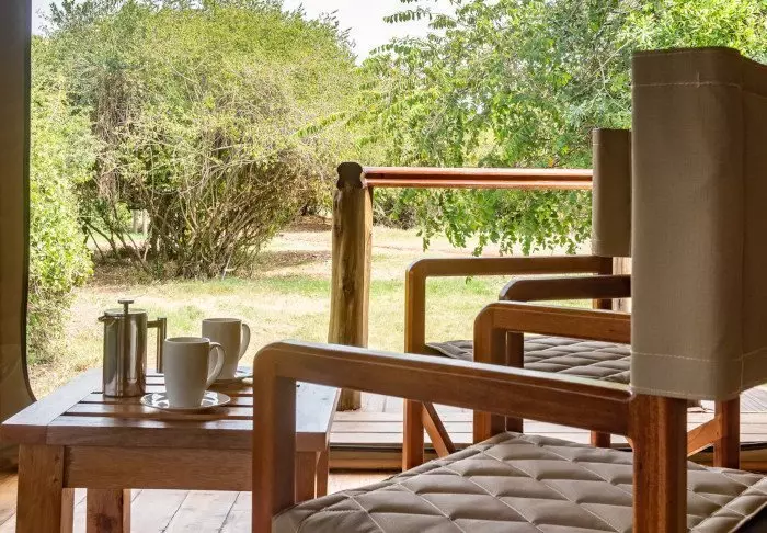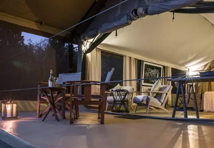 Jokaisessa teltassa on tuuletin, juomavesiannostelija ja sängyissä hyttysverkot. Matkatavaroille on hyvin tilaa, ja teltassa on myös viihtyisä lukukulmaus. Verannalla on mukavat istumapaikat, jotka sopivat erinomaisesti viinin nauttimiseen ja auringonlaskun ihailemiseen Afrikan savannin yllä.