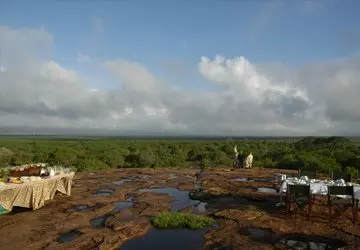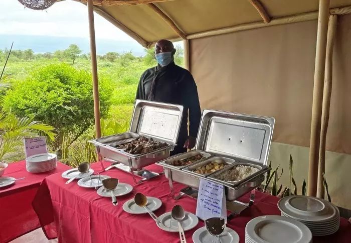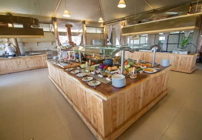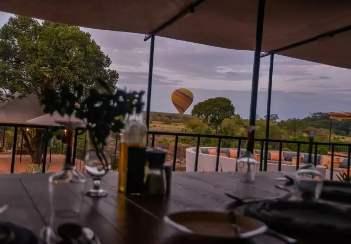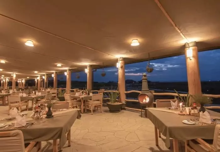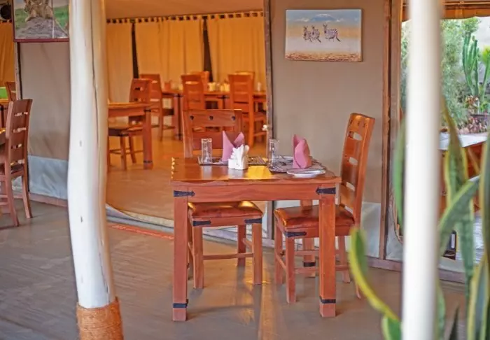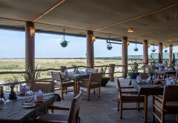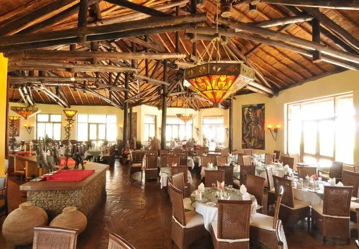 Ateriat tarjoillaan osittain avonaisessa ravintolassa, josta on näköala Kilimanjarolle.