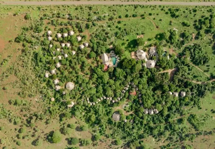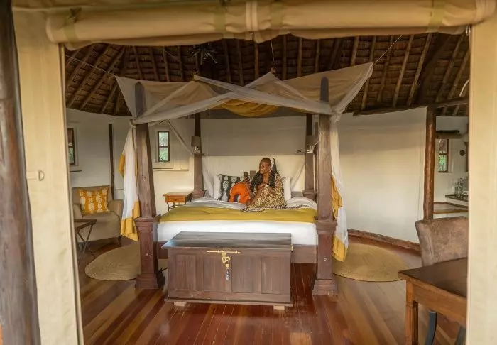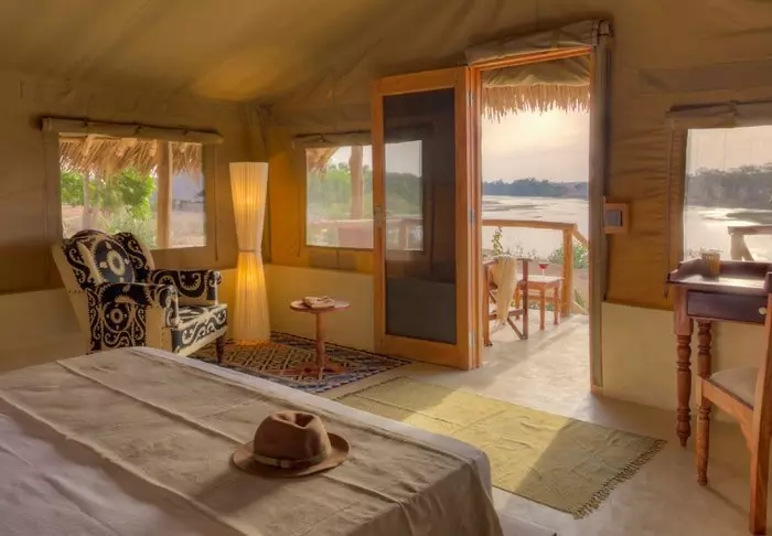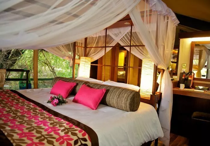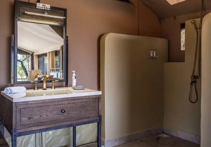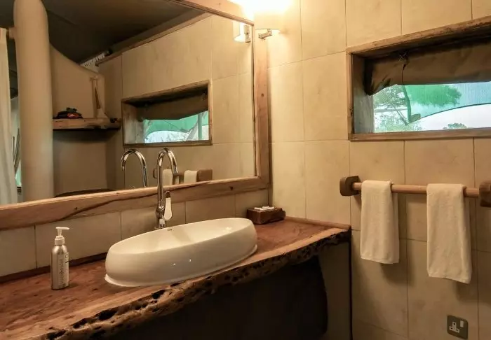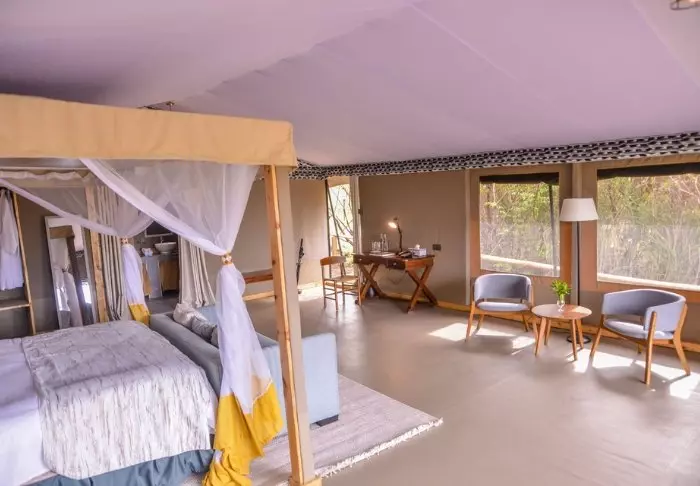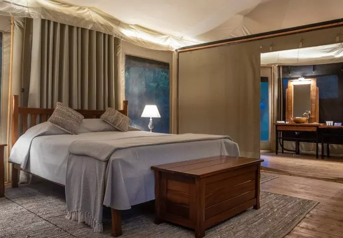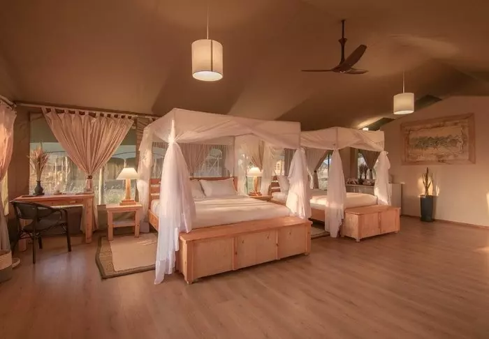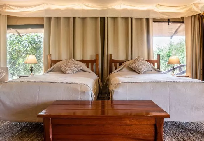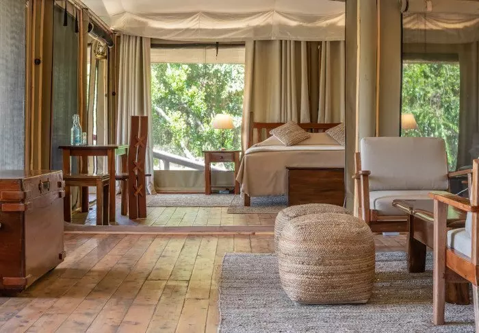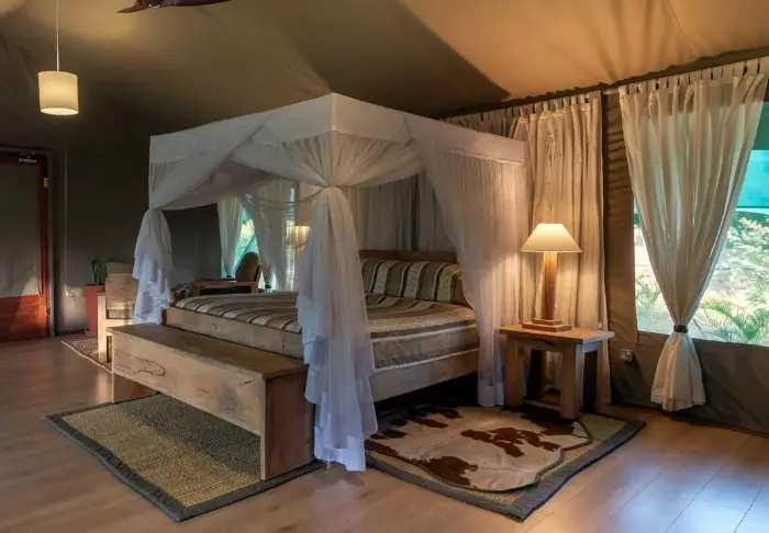 Leiri koostuu 28 hyvin varustellusta teltasta, joissa on hyttysverkot, kylpyhuoneet ja oma terassi – osasta on näköala savannille ja osasta joelle. Kaikissa teltoissa on kangasseinät ja -katto, joten voit sekä haistaa että kuulla luonnon teltan ulkopuolella.