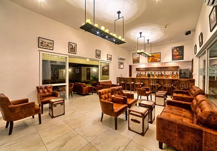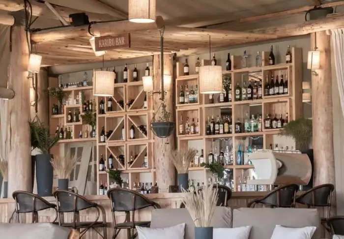 Baari ja ravintola ovat viihtyisiä ja kutsuvia. Asiakkaiden käytössä on pehmeitä sohvia ja viihtyisiä oleskelunurkkauksia, ja kuten teltoissakin, niiden sisustuksessa on käytetty luonnonmateriaaleja, kuten puuta ja kiveä. Värit ovat hillittyjä, jotta pääpaino olisi luonnossa.