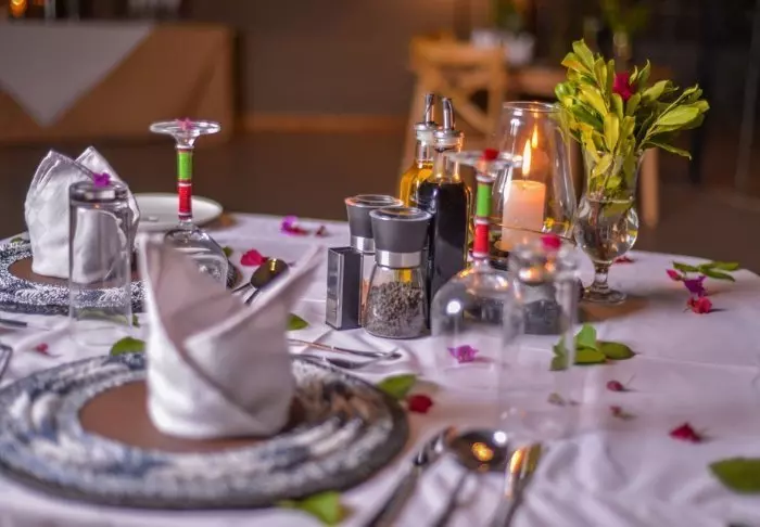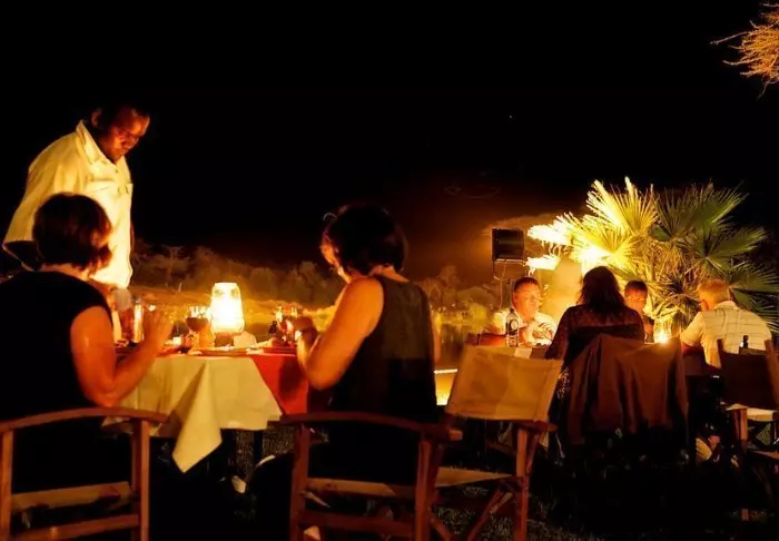 Ateriat tarjoillaan päärakennuksessa, jossa sijaitsevat myös vastaanotto ja viihtyisä baari. Valittuina iltoina baarissa on joskus live- musiikkia. Ravintolan edessä on suuri nurmikkoalue, jossa on penkkejä ja mukavia nurkkauksia, joista voi ihailla näkymää vesialtaalle. Ravintolan ja telttojen välissä on uima-allas, jota ympäröivät aurinkotuolit.