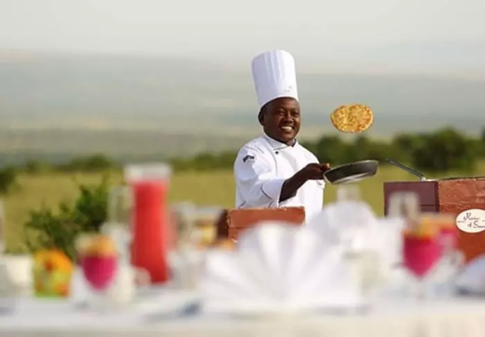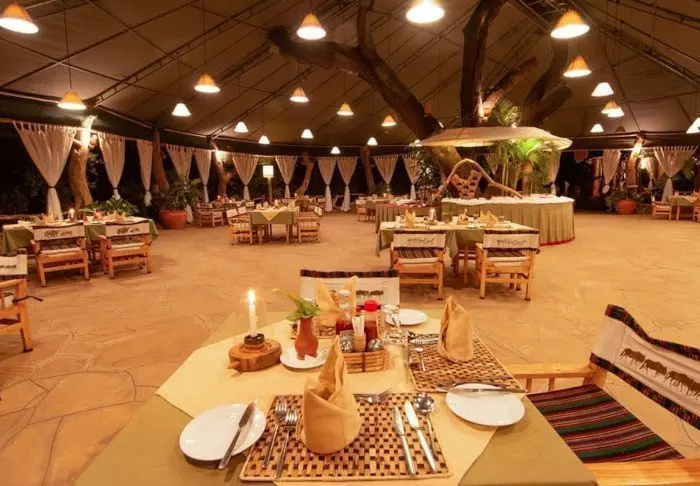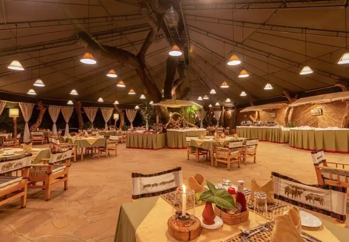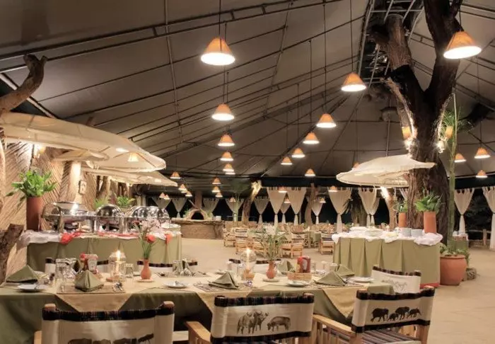 Messiteltassa on tarjolla hyvää ruokaa ja kiehtovia safaritarinoita. Myös messiteltan seinät ovat kangasta, ja kauniit kalusteet ja taidokkaasti valmistetut valaisimet luovat juuri sopivan ylellistä tunnelmaa.