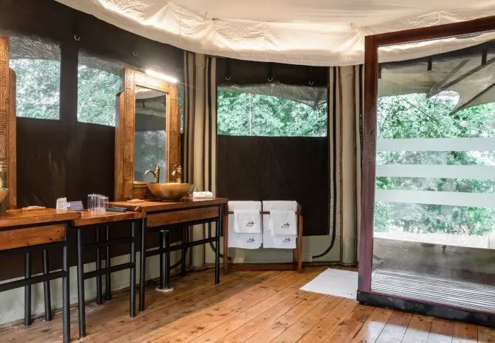 Telttoihin kuuluu luonnollisesti oma kylpyhuone, jonka suihkusta on näköala ulos.