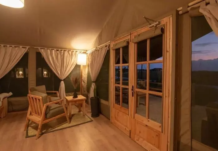 Leirin 12 telttaa on sisustettu kaikkien taiteen sääntöjen mukaan pehmeillä sängyillä, puulattioilla ja värikkäillä matoilla. Tilaa riittää sekä sängyille että pöydälle ja nojatuoleille. Kaikissa teltoissa on luonnollisesti oma kylpyhuone, jossa on juokseva vesi (kylmä ja kuuma). Kaikissa teltoissa on oma terassi, johon kuuluu pikkuinen plunge pool -allas, jossa on mukava vilvoitella kuumimpina päivinä.
