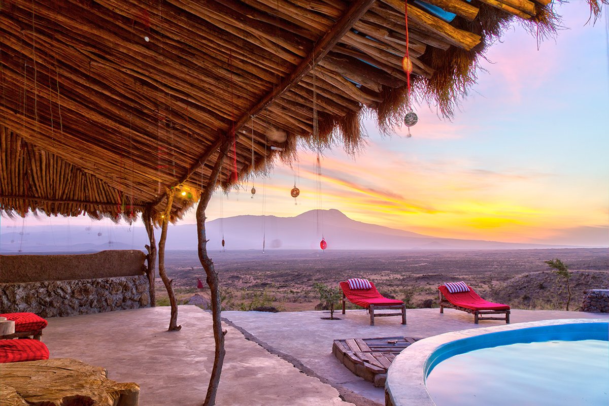 Vietät yön perinteisessä maasai-mökissä, jossa on WC, sähkö ja kuumavesisuihku – ja sänky strategisesti sijoitettuna, jotta voit katsella auringonnousua Kilimanjaron yllä aamun ensimmäisinä tunteina.