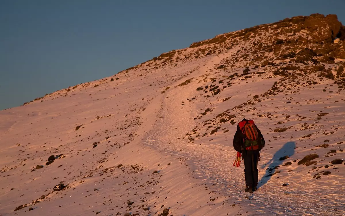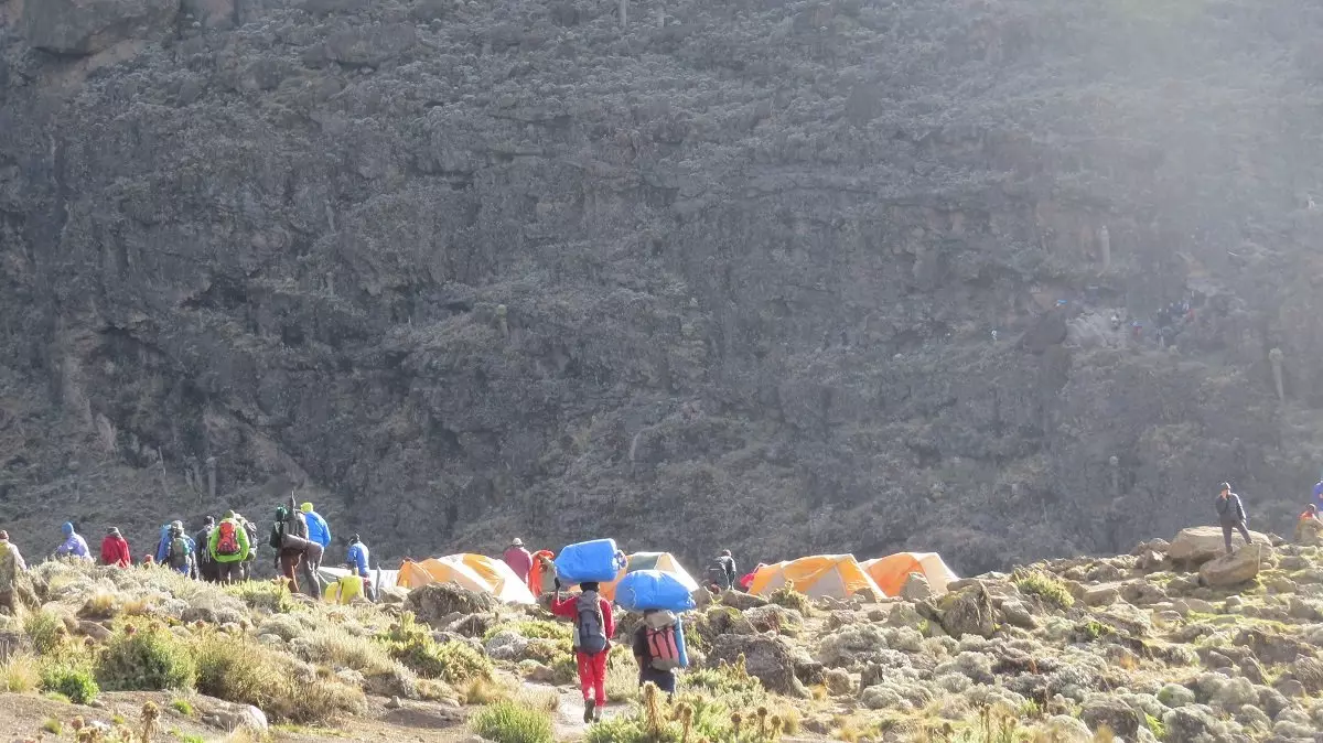 Vaikuttavan Great Barranco Wallin kupeessa vietetyn yön jälkeen nautitaan tukeva aamiainen ja lähdetään nousemaan tätä kuuluisaa jyrkännettä. Kaikeksi onneksi jylhän jyrkänteen kiipeäminen on helpompaa kuin miltä näyttää. Verhomaisen Heim-jäätikön alta Kilimanjaron henkeäsalpaava maisema avautuu koko komeudessaan.