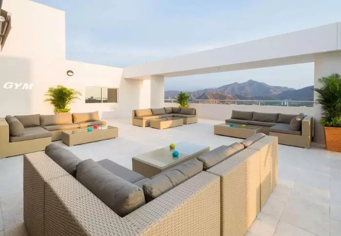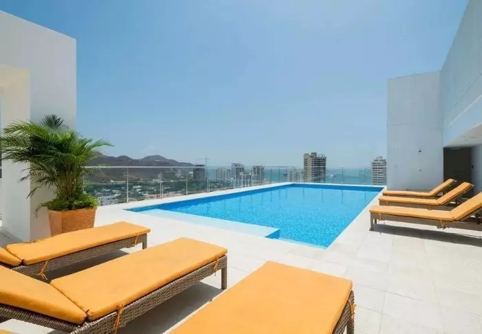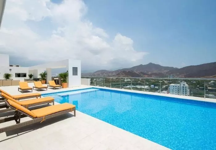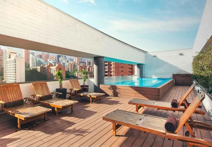 Hotellin kattoterassilta voit ihailla Medellínin upeaa kaupunkisiluettia, ja samalla rentoutua porealtaassa tai aurinkoterassilla.