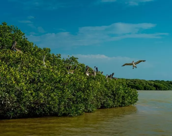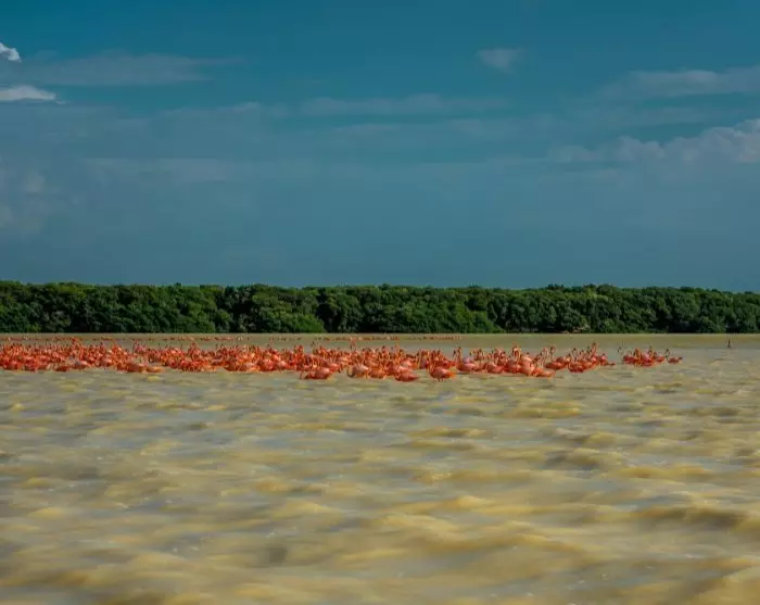 Saavuttuasi Celestuniin lähdet ensin veneretkelle kansallispuistoon, joka tunnetaan mangroveistaan ja vaikuttavasta linnustostaan. Suurimman osan vuodesta voit nähdä kokonaisia parvia kauniin vaaleanpunaisia flamingoja, jotka monien muiden eksoottisten lintujen ohella pitävät puistoa kotinaan. Villieläimiä on Celestunissa yleensä runsaasti, joten pidä silmäsi auki – saatat jopa nähdä krokotiilin matkan varrella. Veneretki kestää noin puolitoista tuntia, ja sen aikana opas kertoo paljon mielenkiintoista tietoa alueesta.