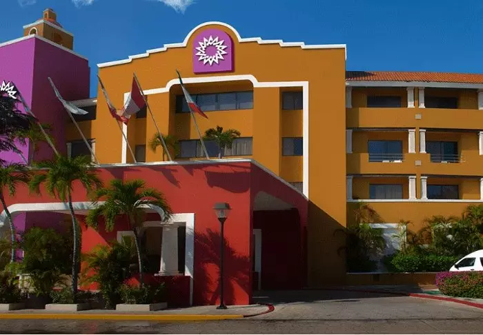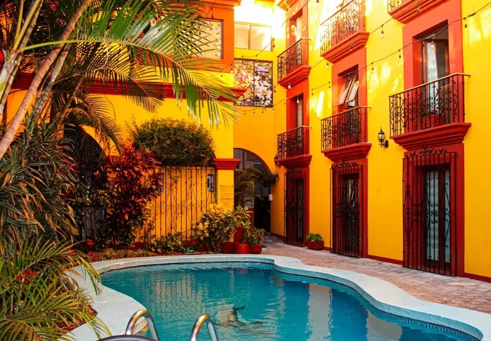 Värikäs hotellirakennus loistaa kauniissa keltaisen, punaisen ja violetin sävyissä, mikä luo paikkaan aitoa meksikolaista tunnelmaa.