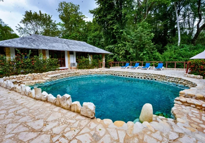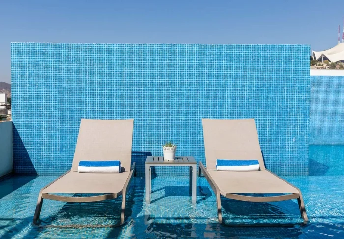 Pulahda virkistäytymään hotellin uima-altaaseen, joka muistuttaa luonnon cenotea, tai nauti viileästä juomasta ja auringon lämmöstä mukavassa aurinkotuolissa.