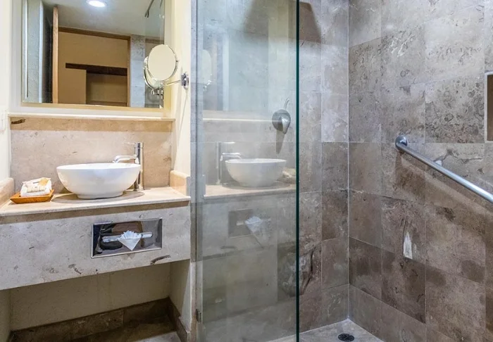 Saat lisämaksua vastaan huoneen, jossa on oma pieni uima-allas (joskus kahden huoneen käytössä) ja osittainen merinäköala / merinäköala.